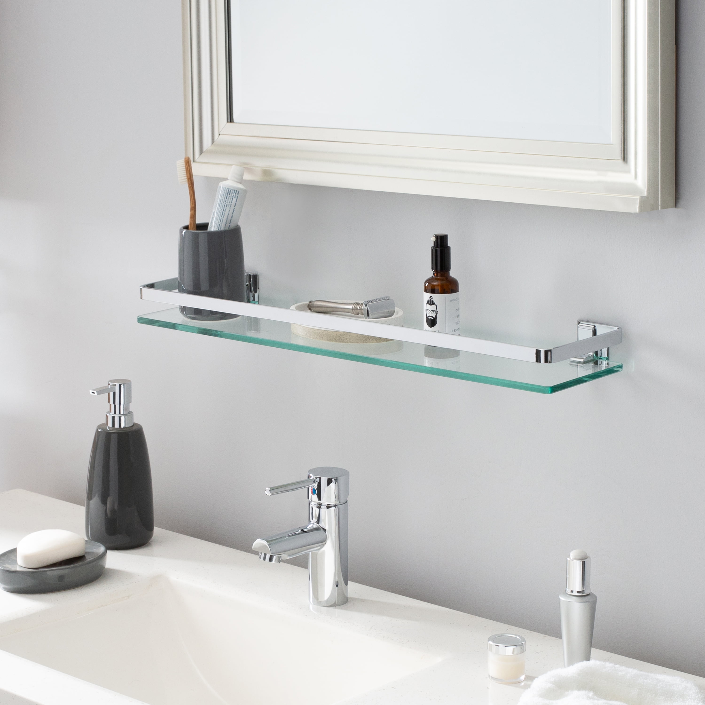 Add a stylish touch to your bathroom with the neu home hanging shelf. Braga glass shelf with towel rail, chrome by valsan bathrooms. 23.5 x 5.5 x 5.2. Buy mounting bathroom glass shelf with chrome finish and rail rectangle/ellipse modern bath shelf organizer wall mounted 20.5 x 4.5 inch at walmart.com Use the shelf for décor or storing towels and bath products, maximizing the space in your bathroom. L single beveled edge bath wall vanity mirror. Its polished chrome finish adds a touch of elegance to your bath space and helps resist stains and corrosion. Rail finished in chrome keeps items secure. Beautiful tempered glass wall mounted shelf compliments any bathroom. Ships free orders over $39. This floating glass shelf with brushed chrome railing is both, a perfect contemporary accent and a functional storage space for your bathroom. Chrome glass shelf with rail is easy to assemble with a screwdriver. Add space and organization to your bathroom with this simple, contemporary style glass shelf.